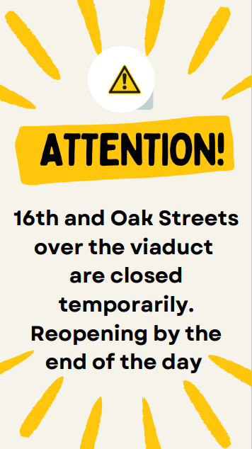 Please note that the street will be closed at 16th and Oak over the viaduct today, 8/4/2025 and will be reopening by the end of the day.