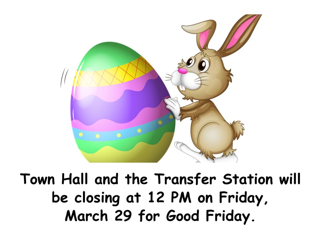 Town Hall and the Transfer Station will be closed at Noon on Friday, March 29th in honor of Good Friday. The Transfer Station will be open and operating as usual on Saturday, March 30th. Town Hall will reopen on Monday, April 1.