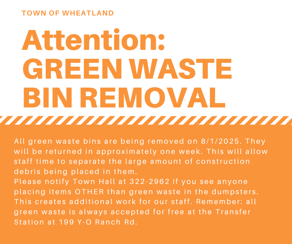 Please note that all green waste bins have been removed from around Town due to the very large amount of construction debris that has been placed in them. Our staff have to separate all of the debris from the green waste. This will go through approximately 8/8/25. All green waste is still accepted for free at the Transfer Station at 199 Y-O Ranch Road.