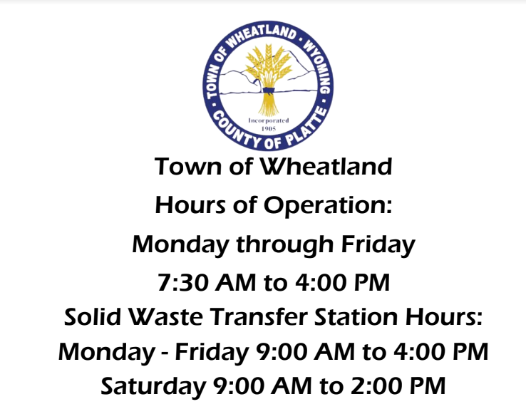 Effective September 30, 2024, Town of Wheatland Hours of Operations are changing a little bit. All departments hours of operations are Monday through Friday, 7:30 AM to 4:00 PM. The Solid Waste Transfer Station will be open to customers Monday through Fridays from 9:00 AM to 4:00 PM and Saturdays 9:00 AM to 2:00 PM.
