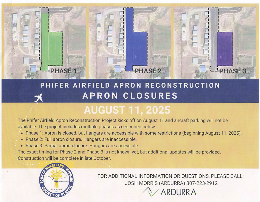 The Phifer Airfield Apron Reconstruction Project begins August 11. Aircraft parking will not be available during this time. This project is broken down into three phases as noted: