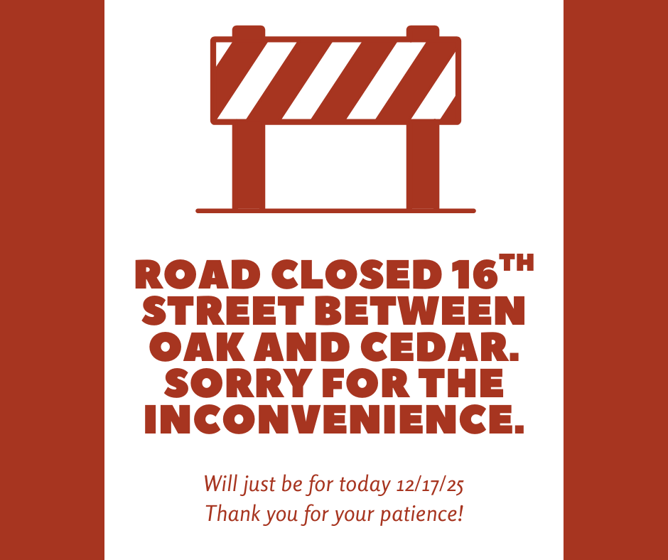 Please be advised that 16th Street between Oak and Cedars streets will be closed for some repairs on utilities. We apologize for any inconveniences that this may cause.