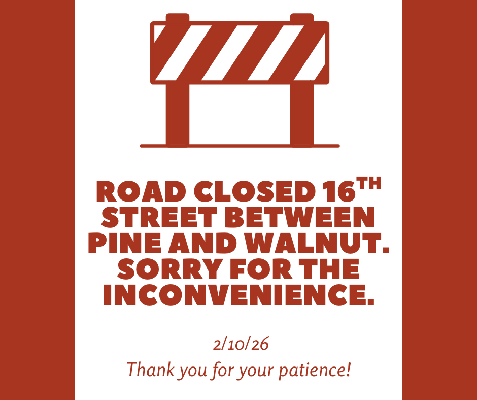 16th Street between Pine and Walnut Streets is temporarily closed. The Town apologizes for any inconvenience as this time. Thank you for your understanding.