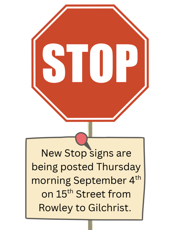 Posted on September 5, 2025 by Darcy Johnson Stop Signs Please note that new stop signs are being installed on 15th Street from Rowley to Gilchrist.