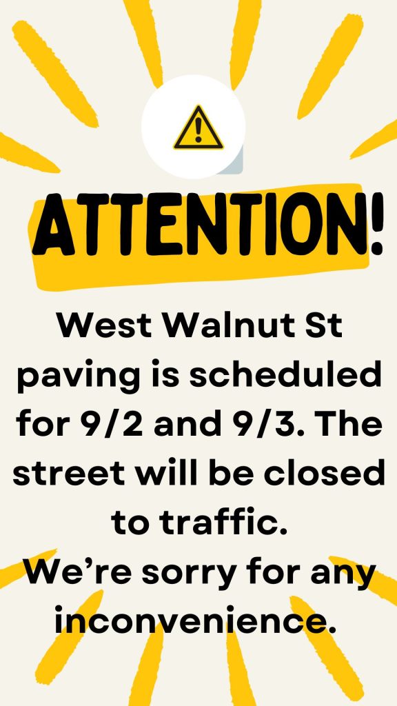 Please be aware, West Walnut Street will be closed to traffic today and tomorrow, 9/2 and 9/3 for paving. The Town apologizes for any inconvenience.